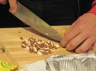 Переставляє кашу на менший вогонь. Подрібнює ножем на дошці мигдаль, несолоний арахіс, волоські горіхи. Дві хвилини намагається зменшити вогонь.