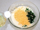 Потім додати борошно і розпушувач, ще раз збити. Всипати сир, часник, подрібнену зелень і влити