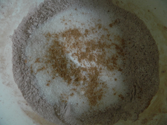 Для тіста жінка змішує у мисці 3 склянки борошна і 0,5 склянки какао. Додає 2 склянки цукру, 1 чайну ложку солі, 1 пакетик ванільного цукру.