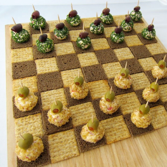 Незвичайна закуска - окраса всього святкового столу. Шашками можна не тільки грати, а й їсти їх. Особливо якщо вони з сиром та оливками. Покриті ароматною зеленою цибулею чи подрібненим горіхом. Лежать ці шашки на полі з хрусткого хліба. Від такої страви гості будуть точно взахваті. А ще від вашої фантазії. Це ж треба таке вигадати. Усе просто готується, а виглядає як шедевр.