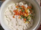 Об'єднуємо всі інгредієнти у посуді, в якому будете готувати страву - рис, кубиком нарізану моркву, горох, кукурудзу та томатно-квасолеву заправку. Додаємо сіль, перець, спеції. Гарно смакує мелений лавровий лист, барбарис, сушені трави. Зверху за смаком можна покласти два-три зубки часнику.