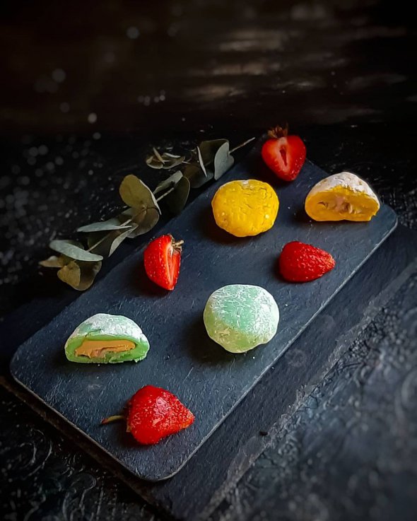 У чаші змішати цукор, борошно й воду, накрити харчовою плівкою й поставити в мікрохвильову піч на 2 хв. Дістати, перемішати й поставити ще приблизно на 1 хв. Тісто має бути без води й за консистенцією липким. На притрушену крохмалем поверхню вилити тісто. Руки й тісто потрібно добре змастити крохмалем. Поки тісто тепле, добре зліплюватиметься. Розтягнути тісто руками в тонкий пласт, приблизно 2-3 мм, вирізати кружальця діаметром 9-10 см. Додати заздалегідь приготований крем, згори викласти полуницю й заліпити по колу. Через дрібне сито притрусити крохмалем моті й поставити в холодильник на 30-40 хв.