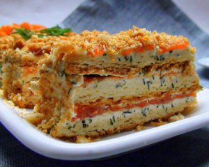 Його хрусткі коржі ідеально просочуються ніжним сиром. А смак збалансовує червона риба.