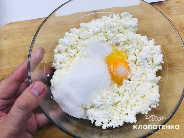 Приготуйте тісто на сирники. Змішайте в мисці 400 г кисломолочного сиру, яйце, 3 ст. л. цукру, 10 г ванільного цукру та дрібку солі для балансу смаку.