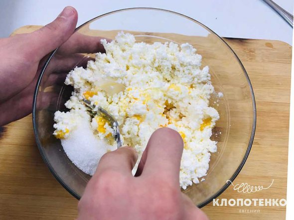 Щоб сирники мали гарну структуру і вийшли смачними, необхідно ретельно перемішати сирну масу, щоб вона була більш-менш однорідною. Це можна робити виделкою, а ще краще за допомогою товкачки.