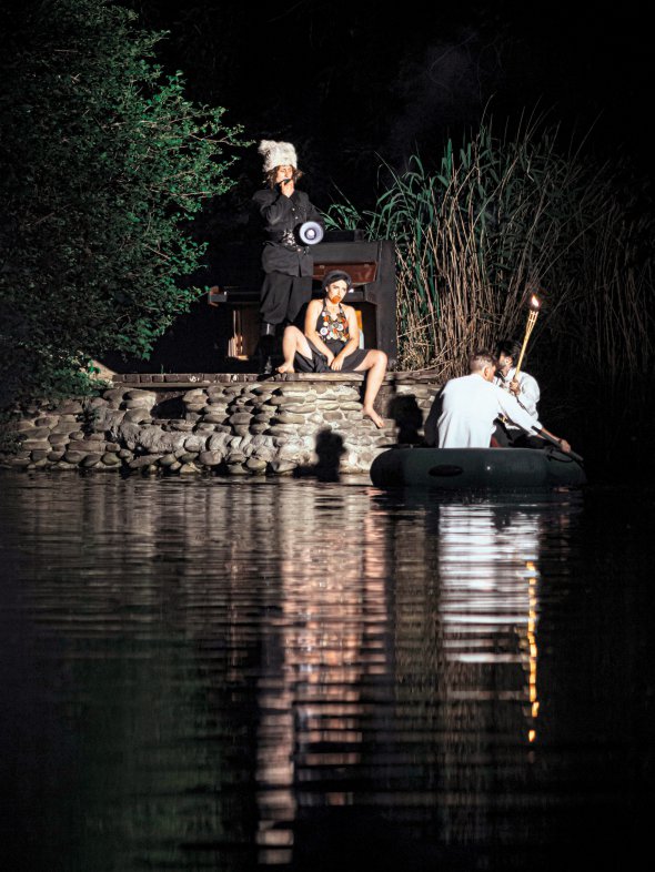 Катерина на коні, якого веде козак у вишиванці, "виганяє" публіку до озера. Йдемо між дерев неосвітленою дорогою. На протилежному березі Нестор Махно, якого грає Володимир Канівець. Оксамитову коробку йому човном везуть Петро з Бароном.