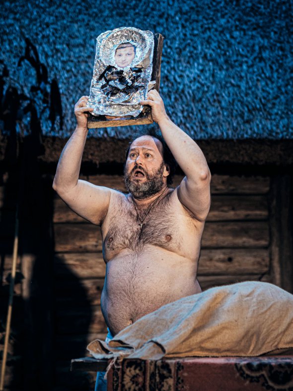 На сцену вибігають більшовики Дуб – актор Дмитро Усов, 29 років, і Пацюк – Володимир Гладкий, 33 роки. Кидаються на Онуфрія вибивати інформацію. Дуб дістає ножем із казанка вареники у сметані, смачно поїдає – так шантажує батюшку.