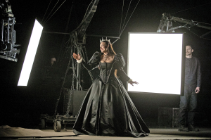 Втім, головний зоровий образ вистави – дуже конкретний, навіть однозначний. На сцені – кілька гіроскопічних кранів зі світловими екранами. Отож місце дії явно нагадує модерну телестудію чи кінознімальний павільйон.