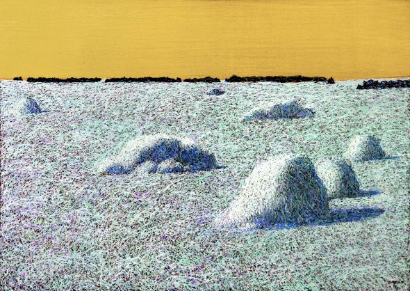Я згадав поле. І щоб було цікаво, намалював там копички. Вони якраз і творять перспективу. Магію. Вони начебто шовкові, втягують всередину. Так витримана кольорова гама, що виглядає, як ілюзія натури.