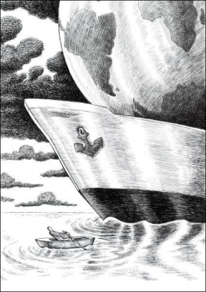 …Над нашим панамаксом (тип судна. — "ГПУ"), десь серед зірок і планет, нерухомо висіло аж п"ять супутників зв"язку: два індійських, два атлантичних і один пацифійський. Кожного ранку данець із Копенгагена ганив мене за те, що ми поперлися під Азори, замість іти напрямки на Флориду. Та грек незворушно відповідав, що данці не мають права вчити навігації еллінів. Може, десь через тисячу років.
