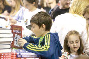 Юний відвідувач ”Книжкового Арсеналу” на стенді видавництва ”КМ-Букс” роздивляється книжку ”Щоденник слабака”. В ній американський письменник Джеф Кінні дає поради учням молодших класів щодо перших днів у середній школі