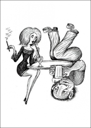 Коли він важко гепнувся на стілець навпроти, дівчина підвела очі від мобільного, по кнопках якого клацала пальчиком, і втупилася непроханому компаньйонові в обличчя. Навіть не звела запитально брови й не вигнула гидливо губки, а от просто втупилася майже без виразу, хіба з ледь чутною цікавістю — як у бездомного собаку, що всівся перед столиком й отупіло хекає, висолопивши плямистого язика. Зненацька цілком притомному, хоч і напівп"яному сантехніку Юрі закортіло крадькома кинути погляд через плече — чи немає в нього хвоста. Він здолав це нездорове бажання й тоном, який вважав за найбільш фамільярний, прогугнявив: