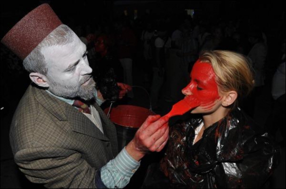 Увечері біля воріт "Мистецького арсеналу" збирається натовп. Охоронці пускають за запрошеннями. Актори російського театру "АХЕ" розмальовують гостей червоної фарбою.