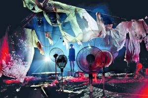 По закінченню "Шоу Б" глядачі йдуть на виставку "Палай, Вавилон". Одна з чотирьох її частин присвячена сучасним війнам. На стенді розвішані обгорілі й скривавлені жіночі нічні сорочки різного крою. Поряд у скляному кубі лежить бараняча голова.