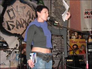 — Любий, — бере слухавку й, перепрошуючи, киває публіці. — Я на сцені, слухай, і тобі буду читати. — І публіці: — Це мій чоловік, він барабанщик.