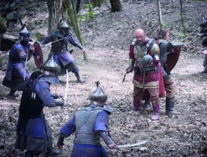 На екрані — вирішальна битва захисників застави з кочівниками. Вороги закриваються щитами.