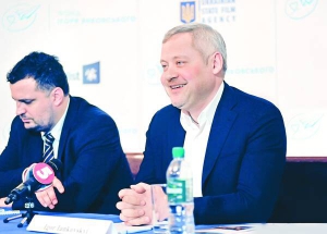На фото ­голова Держ­кіно Пилип ­Іллєнко (зліва) та меценат Ігор Янковський на прес-­конфе­ренції в Лондоні