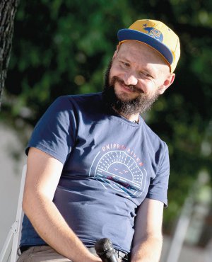 Вокаліст етногурту ”ДахаБраха” Марко Галаневич бере участь у публічній розмові під час фестивалю високого мистецтва ”Букет” на подвір’ї Софійського собору в Києві