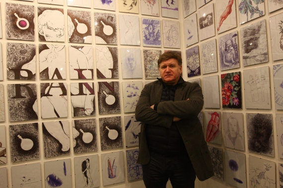 На експозиції показують малюнки за 10 років. Багато робіт із текстами. На одній під великим червоним хрестом написано: "Мужчина, это не инсталляция, это медпункт. Заходите", на другій - "При наличии удостоверения союза художников – скидка 50% на сахарную вату".