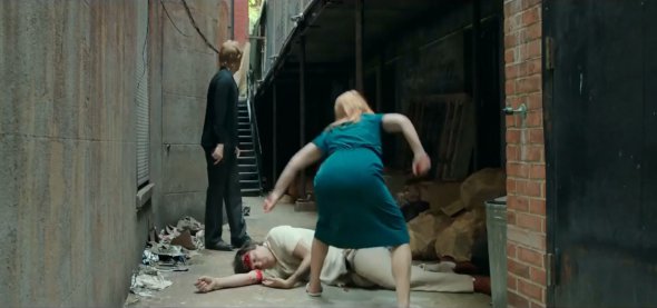 Домогосподарка тягне мішки зі сміттям до найближчого баку. Раптом ззаду на нещасну накидається ватажок місцевої мафії. Масними пальцями піднімає поділ синьої сукні. Ту сковує страх. Жінка вжимає голову у плечі і ладна коритися ґвалтівнику. Лунає постріл. Шматочки мізків зкрапують із її світлого волосся. Злочинець валиться на асфальт. Нереалізована жертва, отямившись, починає ногами лупцювати вже неживе тіло.