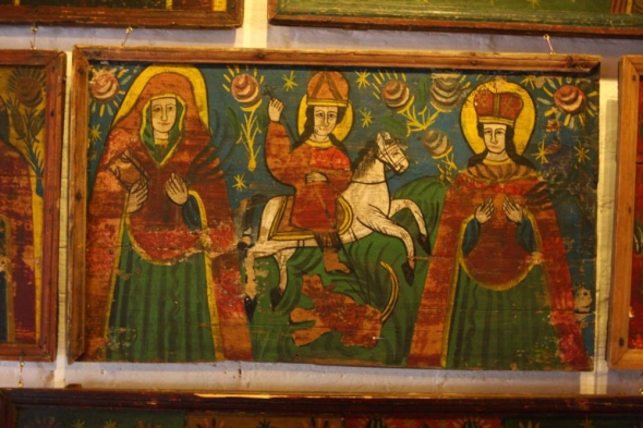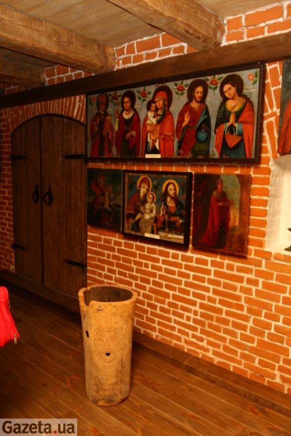 Зовсім інші образи київські. На них темно-коричневий фон, чорні сині і зелені німби. Це унікальне явище в іконописі — каже власниця музею: "Такого більше ніде не побачите. Це вплив Києво-Печерської Лаври на іконопис всієї Київщини".
