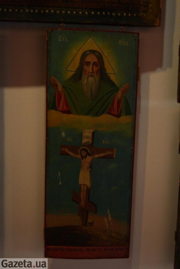 "Маю скриню, яку сколотили з обезглавлених ікон 18 століття під час сталінщини, - повідомляє власниця образів. - Маю металеву ікону з простріленим німбом. Цю ікону подарував в колекцію отець Анатолій Лютюк. Коли він був ще дитям, ця ікона стояла в них на божничку. В хату зайшов радянський офіцер і стріляв по божнику, по іконах, діти ховалися в цей час під столом".