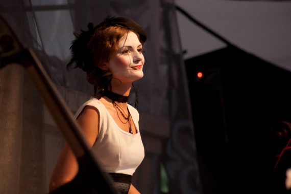 "О, с моей любимой начали", - коментує чоловік, років 25, у рудих джинсах і оливковій футболці. Одна з дівчат зі сцени кидає троянду в зал, у відповідь летить букет дрібних ромашок, розсипається на голови співачкам. За кілька композицій акторки скидають халати й хустки, лишаються у білих коротких сукнях, чорних гамашах і таких самих грубих чоботах.