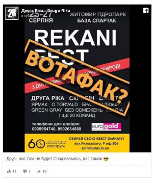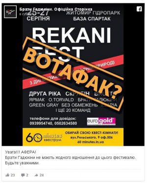 У Житомирі анонсували фейковий Rekani Fest. В афіші написали, що проходитиме він 25-27 серпня в тамтешньому гідропарку. Заявили про виступи гуртів: "Скрябін", Brutto, O.Torvald, "Ярмак", "Брати Гадюкіни", Green Gray - так назву гурту написали в афіші, "Без Обмежень", ILLARIA, "Друга Ріка" і ще учасників.