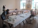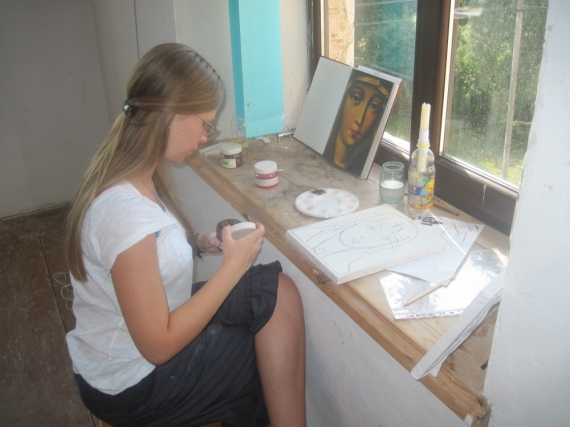 "Учні вчаться робити ікону від початку - самі готують дощечку, наклеюють полотно, роблять ескізи, розмальовують, - розповідає координатор, іконописець Тетяна Скоромна. - За два тижні мають намалювати дві ікони - одну для монастиря, другу для себе. У першому випадку ми даємо завдання на конкретний образ, у другому - учень сам вибирає собі образ, який хоче намалювати. Ми ж вчимо малювати традиційні українські ікони. На Русі їх малювали переважно на липових дошках, які склеювали з кількох частин і закріплювали на торцях шпугами. На дошку наклеювали стару тканину, щоб міцніший був зв'язок із гіпсовим чи крейдяним покриттям, на якому малювали яєчною темперою відповідно до гравійованого рисунка. Його наносили попередньо по ще мокрому грунту. Яєчна темпера - це суміш жовтка, фарби та пива. Закінчену ікону покривали оліфою."