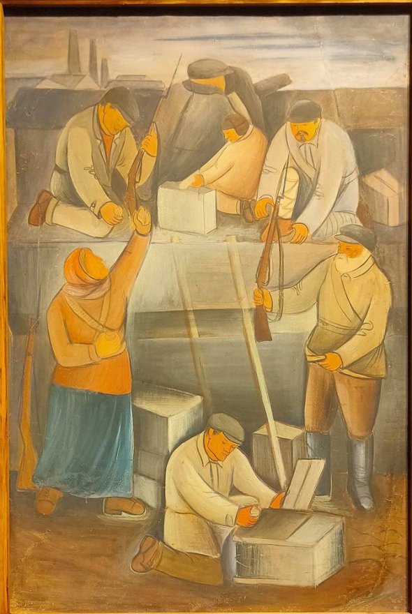 На роботі зображений сюжет оборони Луганську. Стоїть бронепоїзд, люди передають зброю. На фоні індустріальний пейзаж. Ймовірно, це ескіз до монументальної роботи, яка була десь в академії. Студенти працювали на ідеологію. Показує той драматичний період, коли від ліричного бойчукізму перейшли до пролетарського мистецтва, яке завело в глухий кут. У 1931-му Бойчук був змушений поїхати до Петербурга. Малевич теж залишив Україну. Художники Кричевський і Крамаренко перебралися до столиці Харкова. Київ залишився обезголовлений. Тут почалося пролетарське мистецтво. Художники копіювали мексиканця Дієго Ріверу. А в 1934 році прийшла смерть усім напрямкам, запанував соцреалізм.