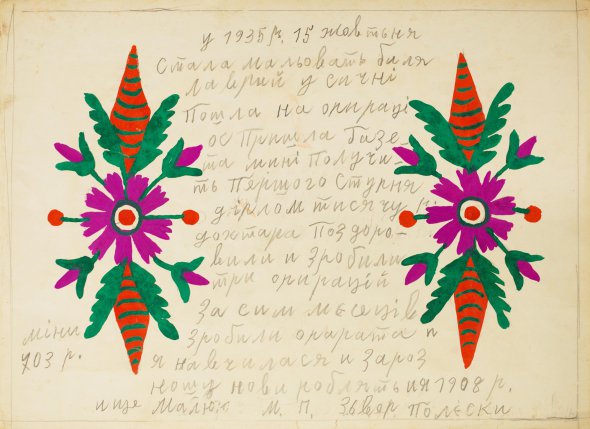 - На початку 1960-х років Марія Примаченко почала створювати колекцію автобіографічних малюнків. Мріяла, щоб вони згодом перетворилися в книгу, - розповідає Анастасія Примаченко, праонука художниці, директорка Primachenko Family Foundation. – На титульній сторінці змальований лев. Гадаю, прабабуся втілювала себе саме в образі царя звірів. Їй були притаманні сила характеру, духу. На звороті описує особливий період свого життя. Коли навчалася в Лаврських майстернях. Там вона зустріла своє кохання, познайомилися з митцями, які стали її друзями. Це був важливий етап формування її особистості. Вклала у твір всю себе. Висловила наболіле. Не любила говорити про свої здобутки. Але цього вимагала ця книга, яку вона створила у своїй уяві. Прабабуся любила дарувати картини. Є лише кілька робіт, які вона підписувала просто "Мак" чи "Квіти". Часто комусь присвячувала роботи, вітала з днем народження чи зі святами. Писала вірші. Робіт з епізодами автобіографії збереглося багато. Написи з боків оформлювала квітами у вигляді скрижалей.
