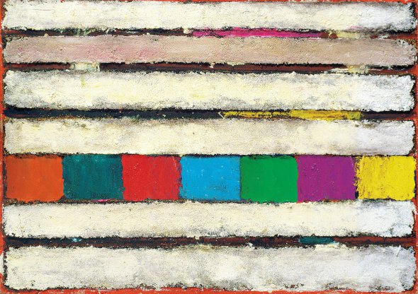 - На одній роботі скомпонував усю "Велику сімку", - розповідає художник Анатолій Криволап. – Написав спеціально до виставки. Має сім горизонтальних смужок, що символізують особистості. А сім кольорових квадратів – це індивідуальності. В чомусь схожі, в чомусь ні. Але працюють разом. Картина великого розміру – два на три метри. В мене була схожа композиція, яка сподобалася куратору проєкту Юрія Комелькову. Побачив в ній "Велику сімку". Але були інші кольори. Тут я спочатку хотів зробити спектр. Зрештою вийшли майже кольори веселки, але в іншій послідовності.