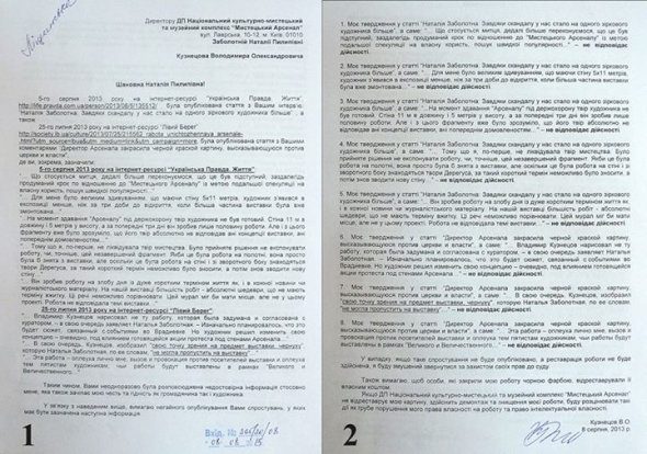 Про це Володимир Кузнєцов написав у листі на ім'я Заболотної, який він опублікував на своїй сторінці у Facebook. "У випадку, якщо таке спростування не буде опубліковано, а реставрація роботи не буде здійснена, я буду змушений звернутися за захистом своїх прав до суду", - пояснює художник.