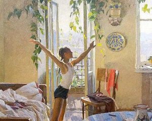 "Ця картинка була в шкільному підручнику, може, і зараз є. З неї писали твори. Мені вона подобалася: світла, радісна, чиста. Трохи італійська - з цим сонцем, арками, листям. І сексуальна, ясна річ. Тетяна Яблонська, "Ранок", 1954 рік. Зовсім недавно відкинувся Сталін, так що картина передала настрій епохи. Ніч пішла, дівчина-підліток схопилася, робить зарядку, вона щаслива, у неї попереду довгий прекрасний день. З вулиці доноситься бадьорий шум. Яблонська написала свою старшу дочку, Олену, їй тоді було 13. Писала в своїй київській квартирі", - розповів у мережі журналіст.