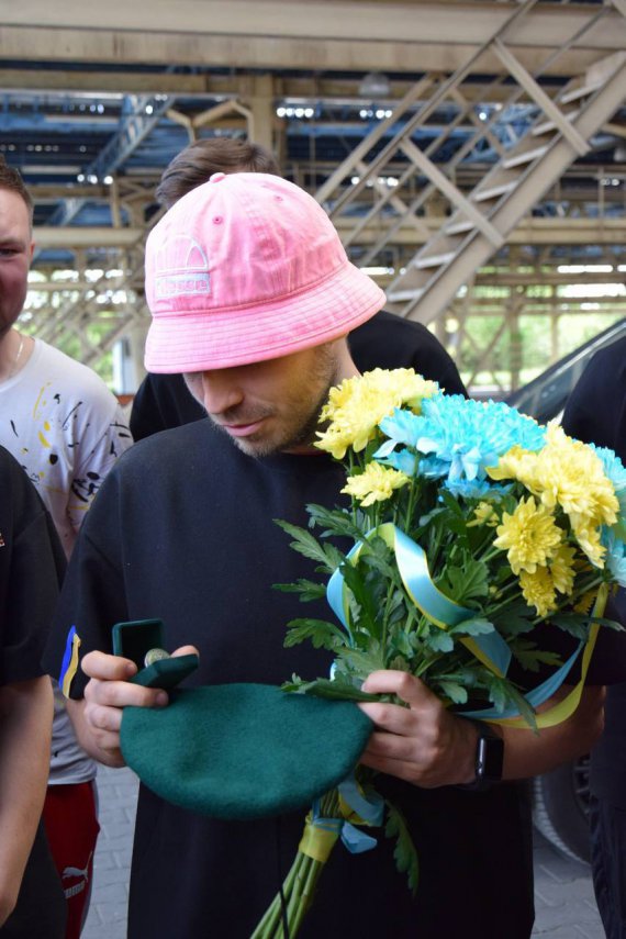 "Найвідомішу рожеву панамку помітили на українському кордоні. Переможці Євробачення Kalush Orchestra вже в Україні. А ще подарували фронтмену гурту зелений берет. Знаємо, що він оцінить", - підписала пресслужба знімки в Telegram.