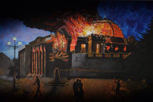 Полотно невідомого автора під назвою "Останній день Ради" продали на аукціоні за 121 тис. грн. На ній зображена Верховна Рада у вогні та люди, що спостерігають за пожежею. Отримані гроші підуть на потреби АТО, розповідає Юлія Нікітіна, правовласниця картини. Торги проходили на інтернет-порталі видання "Левый берег".