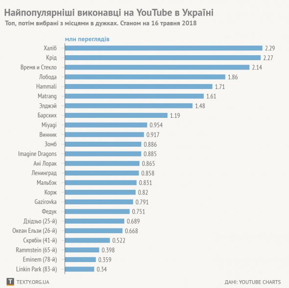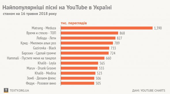 Інфографіку про те, яким пісням і виконавцям віддають перевагу українські користувачі відеохостингу опублікували Тексти.org.ua.