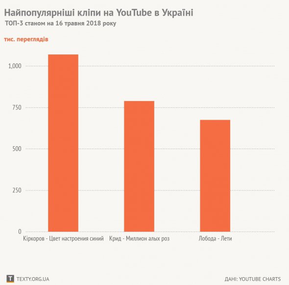 У рейтингу переглядів офіційних кліпів домінують Кірковов "Цвет настроения синий", Крід "Миллион Аллых роз", Лобода "Лети".