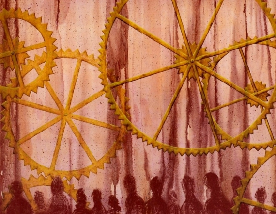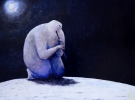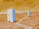 На картині "Втеча" головний герой втікає з будинку-холодильника, такого собі стабільного, мертвого комфорту. "Я не задумуюся над концепцією, картини наче малюють самі себе. Це вже потім, я дивлюсь на них як глядач й усвідомлюю, що ця от про "внутрішню міграцію". Не далеко, правда, він втік. Сидить, напевно, очікуючи автобуса".