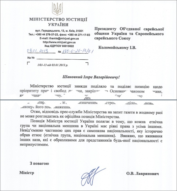 "Вважаю, що вживання інших назв, які є образливими для представників будь-якої національності, є неприпустимим", - йдеться у листі Лавриновича президенту Об'єднаної єврейської громади України і Європейського єврейського союзу Ігорю Коломойському.