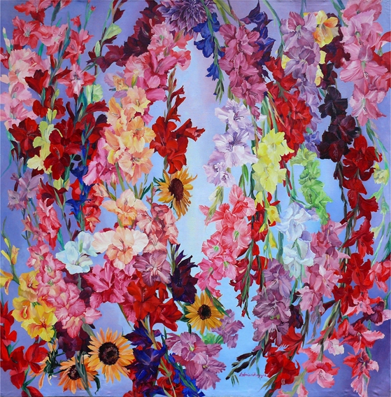 "Головні герої картини — гладіолуси, - каже художниця. - Гладіолус — це меч, м'яка війна. Квіти почала малювати, коли отримала польську стипендію "Гауде Полонія" у Варшаві в середині 2000-х. Раніше займалася рисунком. Була куратором міжнародних виставок. Коли вирішила змінити тему творчості, один польський мистецтвознавець сказав: "Треба мати сміливість, аби у нас час малювати квіти". Мав на увазі, що ця тема зараз неактуальна. Я малюю портрети квітів, їхні очі, що дивляться на нас. Через них я показую безкінечність".