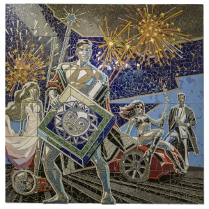 "Для мене радянське мистецтво - це художня цінність", - розповідає Кадирова. - "Мені дуже подобаються монументальні роботи тих часів: держава виділяла кошти на суспільне, над ними працювали цілі комбінати. Художників було багато, вони їздили в регіони, оформлювали там пошти, колгоспи, клуби, навіть автобусні зупинки. Я купувала залишки смальти у радянського архітектора, який сам працював над такими панно. Коли він побачив ескіз моєї роботи, сказав: "При совку була одна фігня, тепер - інша". Це так і є, тоді нав'язували певну ідеологію, зараз реклама так само нав'язує образи і ідеали. Ці ідеали змінюються з часом, але людям завжди потрібен герой. Спочатку задумувала, щоб робота була ззовні будинку, але навколо ПінчукАртЦентру мало місця на стінах. Таке панно має бути на фасаді панельного радянського будинку. Коли люди ростуть поруч із мистецтвом, вони виховуються інакшими."