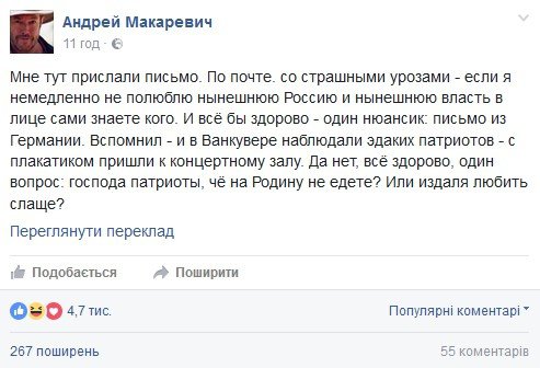 "Згадав, і в Ванкувері спостерігали таких собі патріотів, з плакатиком прийшли до концертного залу. Та ні, все здорово, одне питання: панове патріоти, чого на батьківщину не їдете? Або здалеку любити солодше?", - запитав Макаревич.