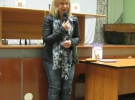 Наталя вітається з дітьми. Говорить в мікрофон.
