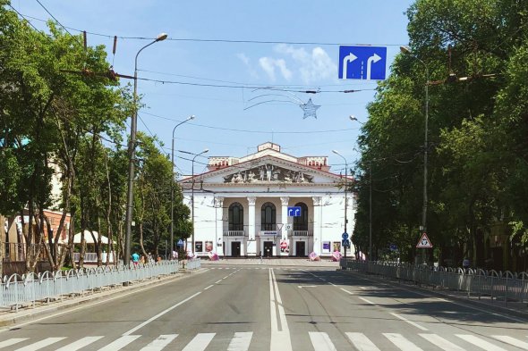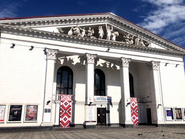"Будівлю драмтеатру звели 1960 року. На фасаді вгорі можна побачити портик зі скульптурами. В центрі – шахтар, сталевар і хлібороб, які уособлюють головні професії Приазов'я і Маріуполя зокрема, а навколо них – музи, які нібито співають хвалебні оди. Найцікавішою деталлю для туристів було те, що драмтеатр розташований майже на тому ж місці, де колись стояла церква Марії Магдалини 1897 року.
