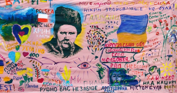 Зокрема 10-метрове полотно (фра нцузький льон, англійські акрилові фарби) розмалювали більше сотні людей на майдані у лютому. Задум полотна - художника зі Львова Володимира Свачія за підтримки Андрія Рудя.