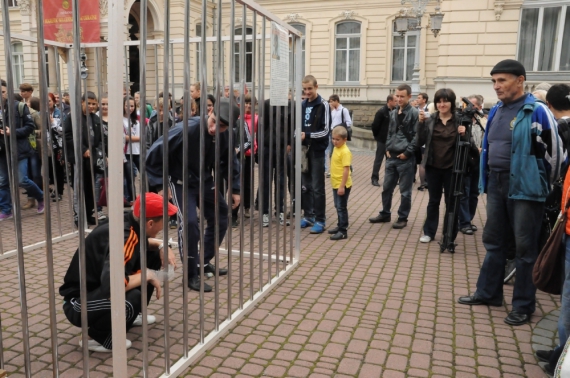 На подвір'ї Палацу мистецтв на вулиці Копеніка, 17 встановили залізну клітку, де увесь день проводять двоє представників жлобства – гопніки з Троєщини. Поряд продають альманах "Жлобологія", календар та футболки із тематичними надписами та малюнками.