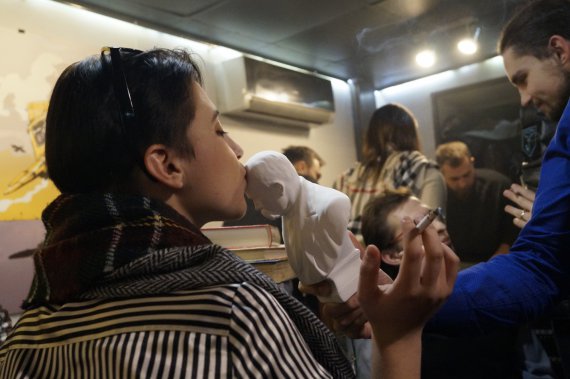 У залі спорудили інсталяцію з книжок, який довершував мініатюрний гіпсовий бюст Кобзаря. Наприкінці читань на чолі Шевченка вже проглядалися виразні сліди губної помади.