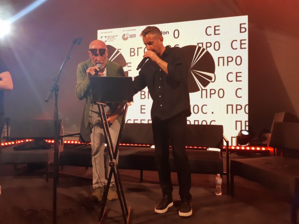 "Я би заспівав пісню про Оксану Забужко, але вона тут, тому не буду," - каже Іздрик зі сцени.