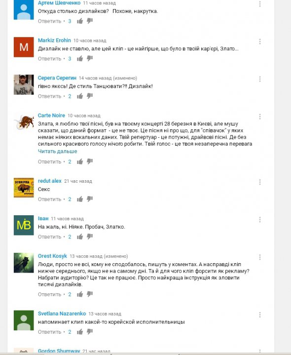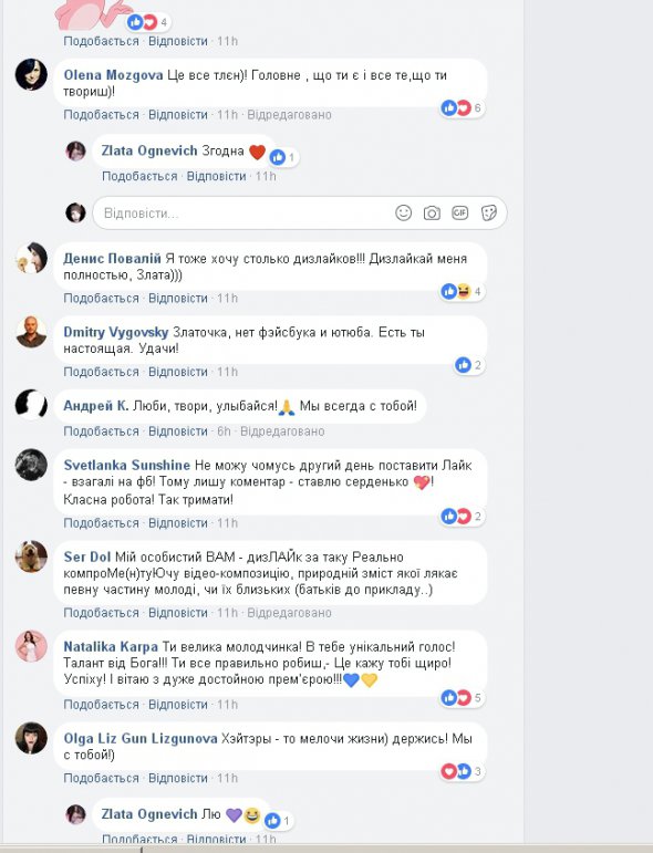Іван Комаров зазначив: "Це звичайна накрутка! Люди... ну, якщо ж ви люди!! Не можна ж так!! Злата Огневич має один з найкращих голосів в Україні. Кліпи всі класні, і мені особисто хочеться, щоб вона продовжувала свою творчість у плані музичних кліпів. Пишіть "повна фігня" під матюкливими російськими відео".